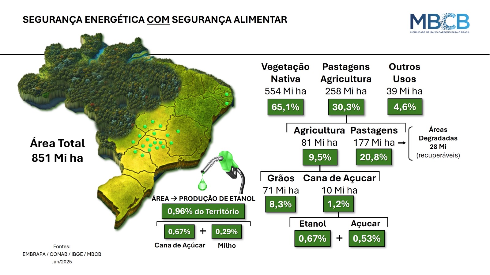 A produção de biocombustíveis no Brasil não compromete a oferta de alimentos—pelo contrário, fortalece a segurança alimentar e energética do país. Com uma matriz energética limpa e diversificada, o Brasil tem potencial para expandir a produção de biocombustíveis sem pressionar a agricultura. Hoje, menos de 1% do território nacional é destinado ao etanol, e há um vasto espaço disponível para crescimento sustentável. Além disso, tecnologias como biodiesel, biogás, HVO e SAF utilizam matérias-primas renováveis e resíduos agroindustriais, reforçando a eficiência do setor sem competir com a produção de alimentos. Com políticas públicas voltadas à descarbonização, o Brasil segue avançando para consolidar um modelo de desenvolvimento sustentável que alie inovação, segurança alimentar e redução de emissões.