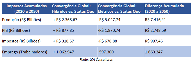 Sendo assim, a comparação da evolução do cenário automotivo até 2050 revelou descobertas surpreendentes. Analisando a convergência global em direção aos veículos híbridos e elétricos, os resultados mostram que os veículos híbridos emergem como líderes em termos de impacto econômico positivo. Os cenários indicam que os veículos híbridos (HEV) não apenas superam os elétricos (BEV) em termos de produção, Produto Interno Bruto (PIB), empregos e impostos gerados, prevendo um aumento significativo de 1.062.947 trabalhadores no setor de transporte e projeção de aumento no PIB da ordem de R$ 877 bilhões em relação ao cenário de controle (Status Quo).